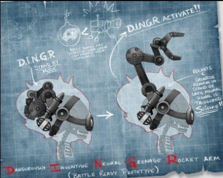 更新后黑默丁格的头发密度大大降低,同时大头还在他的头上安装了名为D.I.N.G.R.的机械手臂。这幅手臂的设计图中明确指出要对那些阻挠科学发展的敌人发射火箭炮以及手雷。