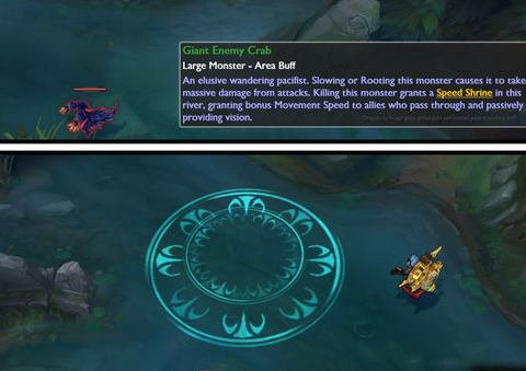 现在打野的难度加强了而同时加强的还有野区的奖励,红蓝BUFF不是1分55秒刷了,现在延时到2分30秒了。所以上路来蹭野区经验的只能先打其他怪了。而且在河道上下两部分都会刷新一个新的野怪深渊巨蟹,这个野怪是为了增加对于小龙和大龙处的控制力,同时在前期可以提供gank的动机以及保护的能力。