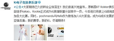 原韩国KT Rolster俱乐部选手kakao、Rookie正式成为iG英雄联盟分部其中一员,kakao也终于不用再山西挖煤了。在之前的报道中大家都知道签约被定到了1000W而破裂的游戏,所以这次的IG签约的价格应该和其他的公司一样,是差不多在500W年薪左右。