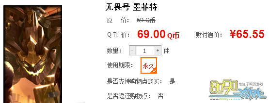 想要购买皮肤的玩家,可以在道聚城进行购买皮肤,这次的皮肤是永久的哦,还是不错的啦,小编已经购买这款皮肤咯,大家可以用两种方式购买,花费69Q币获得,或者是用财付通花费65,55获得皮肤。