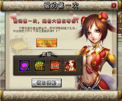 【活动介绍】:首充礼包抢先领取。游戏上面显眼的活动按钮。