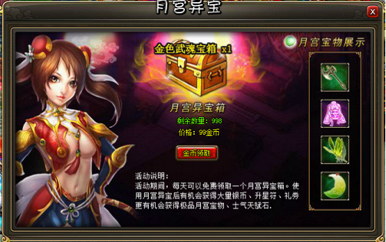 7. 除此之外,玩家还可以额外花费金币领取月宫异宝,金币领取999次,每次只需99金。每次购买消耗的金币是固定的。