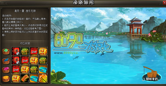 5.        点击收获上钩的鱼,就能获得奖励道具,不同鱼对应的奖励不同,可参照对应奖励表,每收获一条鱼就可获得对应奖励中的其中一种物品奖励。