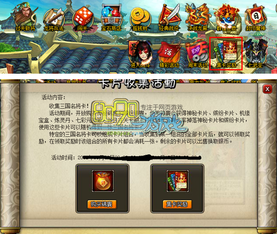 活动参与条件:活动开启后,玩家等级≥70级可参加活动,点击集卡奖励进入活动界面。可以看到购买锦囊和集卡奖励的按钮。