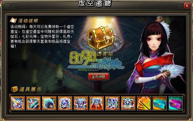 活动期间,每天可以免费领取一个虚空遗宝,在虚空遗宝中可随机获得高级天赋石、七彩元神、宝物升星符、礼券,更有机会获得120级擎天稀有套装和极品将魂宝箱!玩家也可花费金币领取虚空遗宝,每天最多可领取999次。