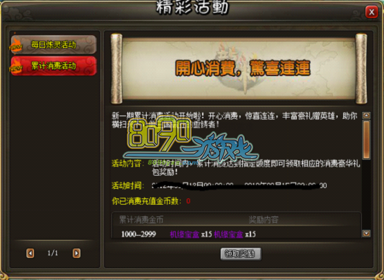 活动一:累计消费活动 新一期累计消费活动开始啦!开心消费,惊喜连连,丰富好礼赠英雄,助你横扫天下,做三国霸业的重铸者! 活动时间:2012年11月16日0:00-11月19日23:59 活动内容:活动时间内,累计消费达到指定额度即可领取相应的消费豪华礼包奖励!