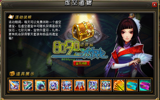 活动期间,每天可以免费领取一个虚空遗宝,在虚空遗宝中可随机获得高级天赋石、七彩元神、宝物升星符、礼券,更有机会获得120级擎天稀有套装和极品将魂宝箱!玩家也可花费金币领取虚空遗宝,每天最多可领取999次。