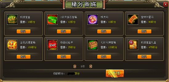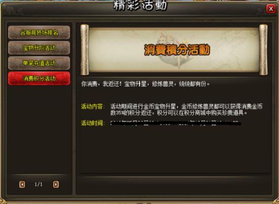 活动内容:活动时间内,玩家使用金币进行宝物升星和兽灵修炼可获得消耗金币35%的积分返还(返还的积分向下取整),使用积分在游戏界面消费积分商城兑换极品道具!