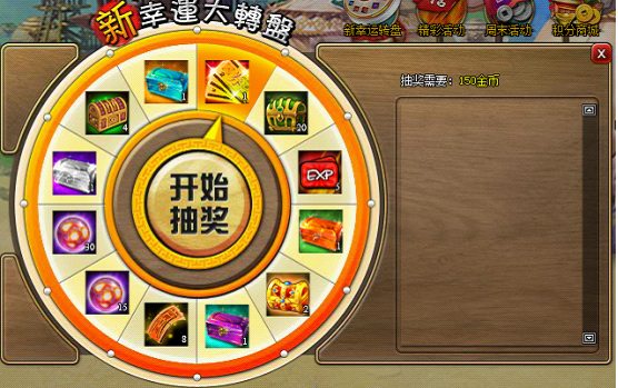 活动内容:活动当天玩家可点击游戏中的“新幸运转盘”活动按钮,在打开的活动界面中参与活动,72级以下玩家每次可花费90金币转动转盘,赢取相应的奖励;72级以上玩家每次可花费150金币转动转盘,赢取更高价值的奖励。