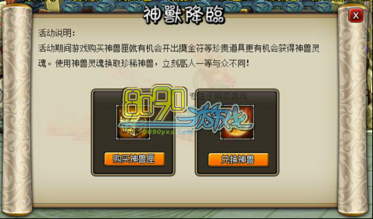 1.玩家点击活动入口,可选择购买神兽匣或兑换神兽。