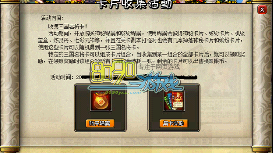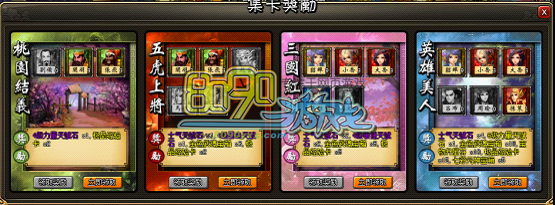 特殊说明:使用神秘锦囊或者缤纷锦囊,分别可以获得“神秘卡片”和“缤纷卡片”。使用神秘卡片后可随机获得一张“桃园结义”、“五虎上将”组合中的三国名将卡。