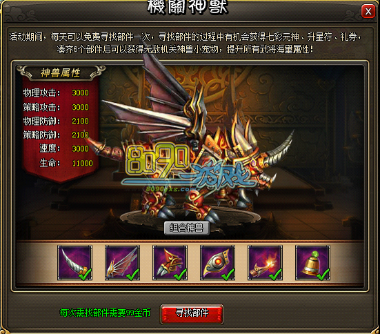 1.活动期间,每天可以免费寻找部件一次,寻找部件的过程中有机会获得七彩元神、升星符、礼券,凑齐6个部件后可以获得无敌机关神兽小宠物,提升所有武将海量属性!