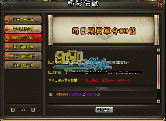 活动内容:活动时间内,每日买军令60个即可领取奖励。