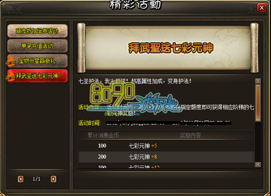 活动内容:活动时间内,每日拜武圣消费指定额度即可获得相应阶梯的七彩元神奖励!
