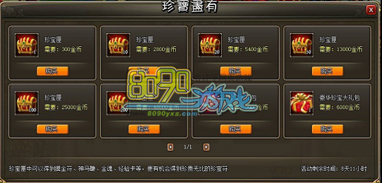活动内容:活动时间内玩家可以使用金币在活动界面购买珍宝匣,使用珍宝匣以后有几率获得机缘宝盒、金魂、经验卡、珍宝符、银币等!活动时间仅有8天,错过机会不再,赶快行动起来,江山美人尽如怀中!