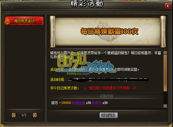 活动内容:活动时间内,每日修炼兽灵100次即可领取奖励