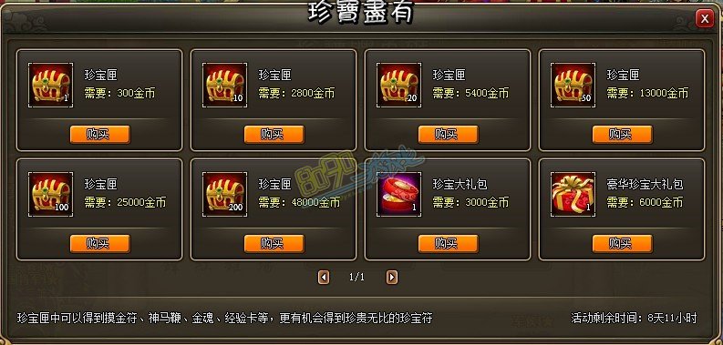 活动内容:活动时间内玩家可以使用金币在活动界面购买珍宝匣,使用珍宝匣以后有几率获得机缘宝盒、金魂、经验卡、珍宝符、银币等!活动时间仅有5天,错过机会不再,赶快行动起来,江山美人尽如怀中!