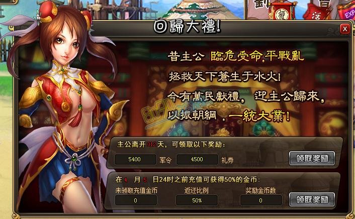 1、回归用户在活动时间内进行充值还可获得50%的额外金币奖励,向下取整。