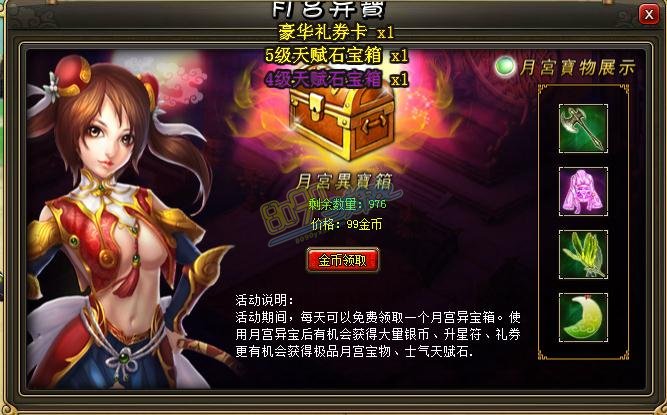 活动期间,每天可以免费领取一个月宫异宝箱,使用月宫异宝有机会获得大量银币、升星符、礼券,更有机会获得极品月宫宝物、士气天赋石!
