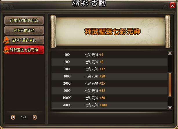 活动内容:活动时间内,每日拜武圣消费指定额度即可获得相应阶梯的七彩元神奖励!