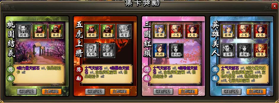 1)特定的三国名将卡可以组成卡片组合,当收集到某一组合的全部卡片后,就可以领取奖励。2)在领取奖励时该组合的所有卡片都会消耗一张。剩余的卡片可以出售换取银币。