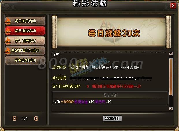 活动内容:活动时间内,每日摇钱满30次即可领取奖励。