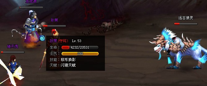 最后一个boss是远古狼灵,技能是全体控制加伤害(太强大了,赖皮啊)。我的出场阵容为前军孙策,中军主将57级、关兴49级、夏侯渊52级,后军蔡文姬49级。主将装备2件50级紫加4件30紫,夏侯渊2件30紫,4件50紫,孙策2件50紫,4件30紫,关兴蔡文姬各种30紫蓝混合装。有图为证。