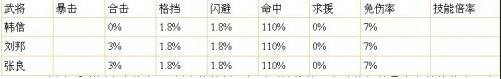 没有看到裸奔金将和110级金将战报,暂时无法推算三名武将初始暴击和技能倍率,未来将跟踪报道。 最后提示一点,7%的免伤率堪称逆天,3%的合击率也是个好东西,给大家一点提示,刘邦配合香香会有什么效果呢?相信以大家的智慧一定可以配置出很多强大的阵型,小弟在此期待!~