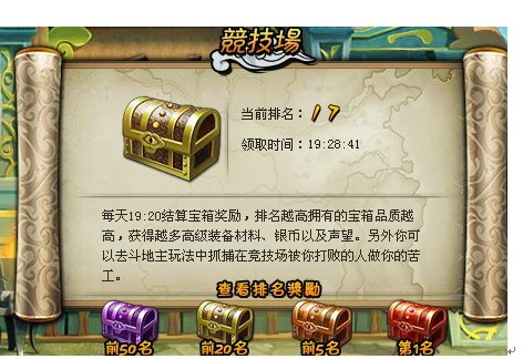 大家很清楚,竞技场里面,50名次是一个分水岭,因此大家无论如何都要把等级排到50.没有50名的话,您的材料将会是一个很大的问题。。(其实一直以来,本人都是靠每天10个竞技场的箱子维持。。。极度郁闷中。。。。)。