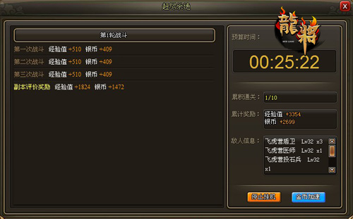 等级是《龙将》里的首要属性,因为很多新功能是必须达到一定等级才会解锁,而提升等级的方法,主要有做任务和刷关卡两种。《龙将》添加了自动寻路和挂机功能,点击任务栏中的蓝色字体,我们就可以准确快捷地到达任务地点,而且当我们打通了一个关卡后,更可以通过挂机功能自动重复地进入该关卡,从而获得大量的经验和银币。