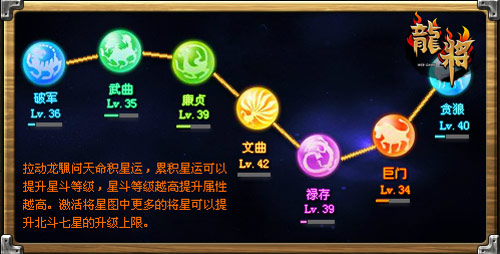 司命延寿,北斗七星。在玩家的将星图进展到一定阶段时,水镜先生就会开启北斗七星系统,帮助玩家进一步提升队伍的属性。破军、武曲、廉贞、文曲、禄存、巨门、贪狼,据说七个星宿都各司其职,并掌握着一种神秘的力量。其中又以贪狼星和文曲星分别主宰人的生死之事,因此当初诸葛亮点七星灯,就是要向这两颗星宿借命。