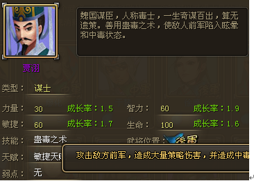 3.技能,大家可能认为其技能可以斟酌,其实好好考虑一下,无论是大量攻击也好,中毒也罢,就连被100%控制一回合也是没用,因为你对的是人家前军。更伤不起的是速度,就算是天生敏捷加成,后军的加成,但是要命的成长率是很难跟人家中军比速度的,就别说对方的姜维了。。。。。。
