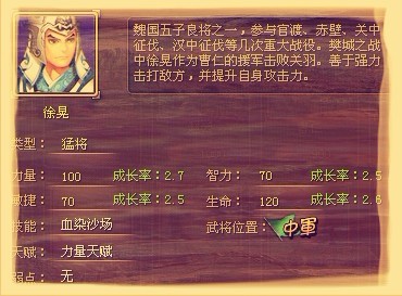 徐晃同样是魏国武将,也有一个称呼,是魏国的五子良将之一。作用:攻击地方前军,同时提升自身攻击力3回合;(招募吗?NO,更好的选择在后面,请大家继续往下看。)