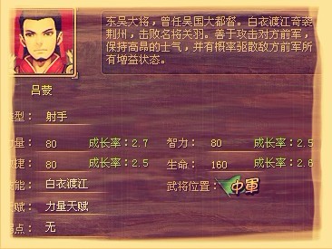 吕蒙吴国水军之一,曾是吴国大都督;技能:攻击前军,造成普通伤害,且恢复100点士气,有机会驱散敌方的所有增益效果。(又是一个猛人,恢复100点士气,那相当于永久满士气,所以一定要招)