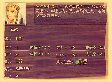 马超来了,第二个蜀国五虎将,人陈锦马超;攻击敌方中军,造成物理伤害,切恢复100点志气。(又一个永久满士气的强人,配合主角技能“合击”极大几率连续两次释放技能,你说能不招吗?)