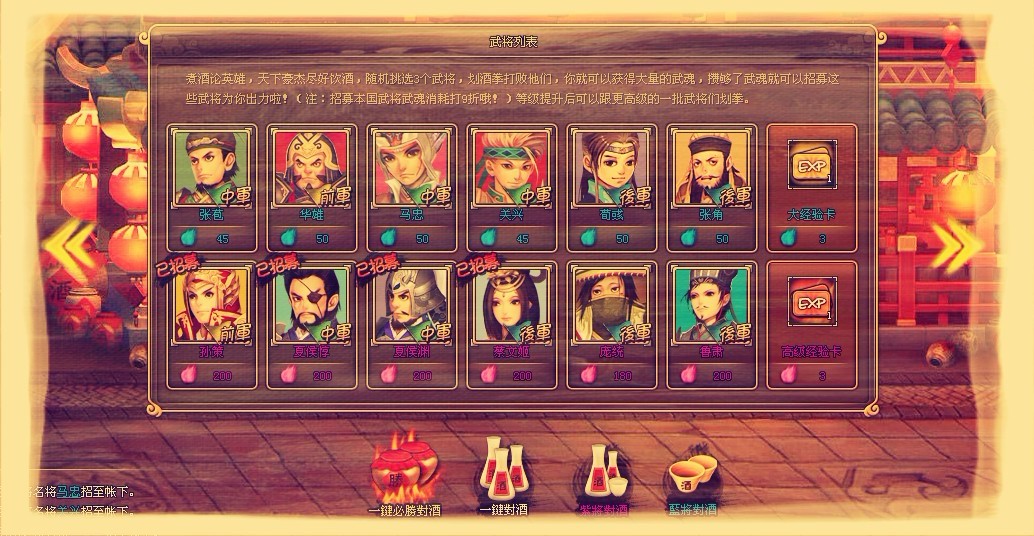 武将搭配好,这个比较重要,开始大家都没装备,差别就是装备强化和升级速度。迅速任务练到30级左右换蓝将,黄盖和于禁。为什么选择于禁呢?于禁特长暴击,对后面的怪物攻城有优势。换蓝将的时候先删除系统送的将,有返还点数应该是10点蓝色武魂。两个系统给的将加起来20蓝武魂,配合系统送的蓝点,招黄盖差不太够,剩下的猜拳,官网大把猜拳技巧自己看,知道你挣到50点蓝色武魂招于禁。