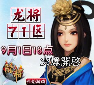 8090龙将-双线71区将于2012年9月1号18点00分震撼开启。精彩即将上演,超乎想象的游戏体验正期待您的加入! 喜迎新服开启,8090龙将已为您准备了丰富的开服活动助你在三国乱世中驰骋沙场、建功立业!