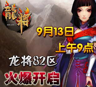 8090龙将-双线82区将于2012年9月13号9点00分震撼开启。精彩即将上演,超乎想象的游戏体验正期待您的加入! 喜迎新服开启,8090龙将已为您准备了丰富的开服活动助你在三国乱世中驰骋沙场、建功立业!
