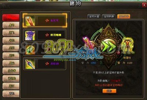 搜索"8090网页游戏"龙将从8阶的月宫异宝,到9阶的四相宝玉,那可想而知后面肯定也会有10阶的上古神器,现在玩家点击宝物阶级那,菜单下拉,就能看到10阶,不过目前还没有宝物,可见这个位置是早就为各位玩家预留好的。