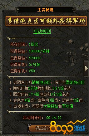 王者秘境中共9处固定泡点位置,1个4倍的,8处双倍的。还有5个随机3倍泡点。图中泡点,金色为4倍,紫色为3倍,蓝色则是2倍。占领泡点可获得大量经验和军功值。玩家往往会因为一个高倍泡点刀兵相见哦,大家在王者秘境中一定要小心谨慎,量力而行。