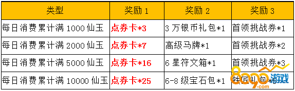 活动内容:在活动期间内玩家每日消耗仙玉达到指定数量即可领取丰厚奖励