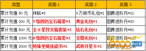活动内容:活动期间内玩家累计充值达到指定金额即可领取丰厚奖励