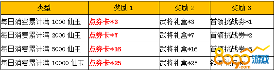 活动内容:在活动期间内玩家每日消耗仙玉达到指定数量即可领取丰厚奖励