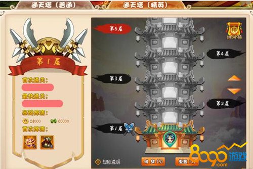 通天塔是8090乐蜀三国中独具特色的挑战任务,分为普通和精英两种,并且已开放50层,凡是等级达到55级的玩家即可前往挑战。玩家每天有三次挑战机会,点击“挑战”按钮,开始从第一层进行挑战,挑战失败挑战机会减少一次。每五层为一个节点,通过节点后方可进行扫荡。若点击“重置”按钮可从第一层重新开始扫荡,玩家每天有三次重置机会,第一次重置消耗200仙玉,第二次重置消耗400仙玉,第三次重置消耗600仙玉。