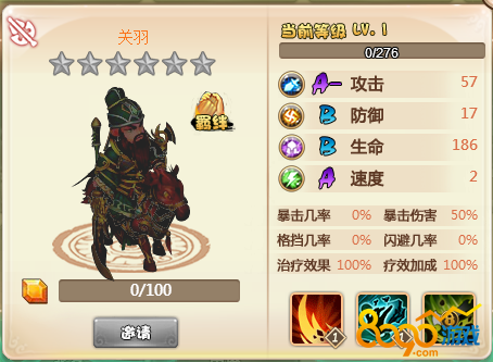 在乐蜀三国中,关羽是目前六大橙将之一的武将,拥有极高的攻击资质,而且拥有骑兵速度贼快的特性,可以说是值得招募的武将。他的技能分为突斩(普攻)、武圣(大招)、拖刀(被动)三大技能,其中突斩和其他武将的技能描述一致,没有太大特别之处。但是武圣和拖刀是该武将的亮点,武圣技能是化身武圣并且获得再次出手的机会,武圣状态下伤害提高12%(百分比随技能等级增加而增加),并且击杀一个目标可以再次出手,效果持续到下回合结束。而被动技能拖刀则是有一定概率连击,连击单独计算命中和暴击,概率连击触发随技能等级增加而增加,最高可叠加到100%的概率连击。