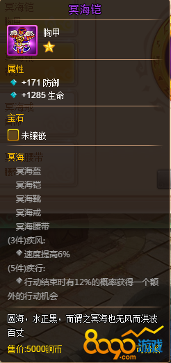 套装小编推荐冥海套,冥海套3件提高速度6%,5件效果是行动结束12%的概率获得一个额外行动机会,配合黄忠被动破甲多进行一次普攻是非常强的,往往第一次没秒杀,触发效果第二次攻击直接击杀,非常好用,是PK、推图的利器。