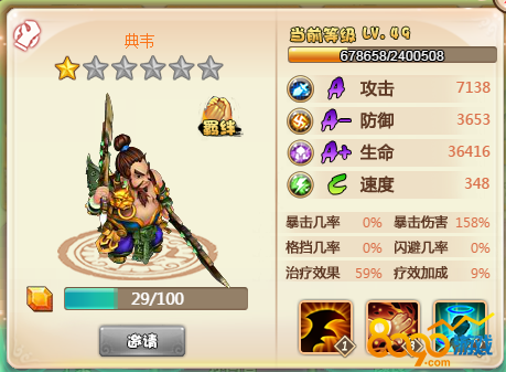 典韦这种血厚防高的武将是每个阵型必备的,所以赶紧入手一个典韦吧!