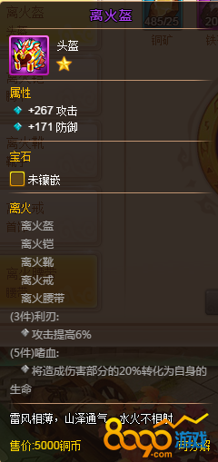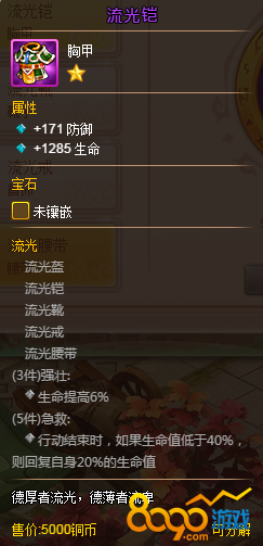 套装的话小编推荐2套套装,流光套和离火套,流光套3件加6%的生命值,5件套是生命低于40%回复20%的生命值,对于肉盾武将来说非常好用。离火套3件是加6%的攻击,5件是攻击的20%转化为生命值,也就是吸血,离火套配上绝灭斩瞬间能吸回5000左右的血量等于一个前期奶妈的治疗量了。