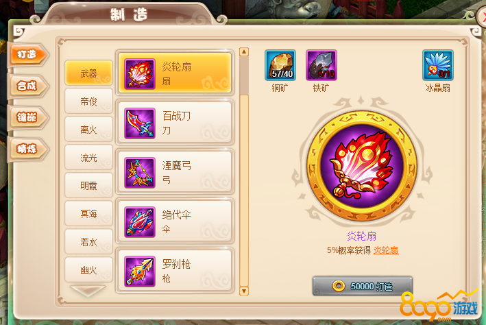 东极剑合成需要铜矿40块,铁矿10块以及冰纹剑作为铺垫合成,合成的几率只有5%,很难得到。炎轮扇需要铜矿40、铁矿10块以及冰晶扇作为材料。百战刀需要铜矿40块、铁矿10块以及寒铁刀作为材料。湮魔弓需要铜矿40块、铁矿10块、寒玉弓作为铺垫。绝代伞需要铜矿40块、铁矿10块以及冰璃伞作为铺垫,罗刹枪需要铜矿40块、铁矿10块,寒霜枪作为材料。