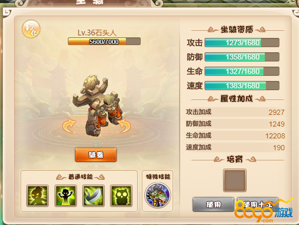 坐骑增加的属性也是非常好的,坐骑资质越高增加的攻击、防御、生命以及速度越高。属性攻击加成、防御加成、生命加成以及速度加成。坐骑有五个技能增加属性效果分别是格挡提高15%、闪避提高15%、防御提高30%、怒气技能消耗降低1点,特殊的技能每个坐骑都不同,例如赤兔的特殊技能是我方所有单位受到暴击时会获得一个能够吸收30%最大生命值的护盾。